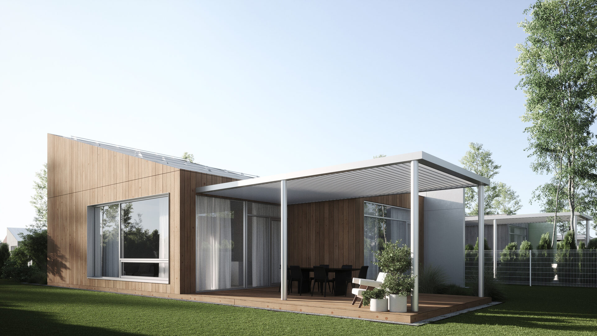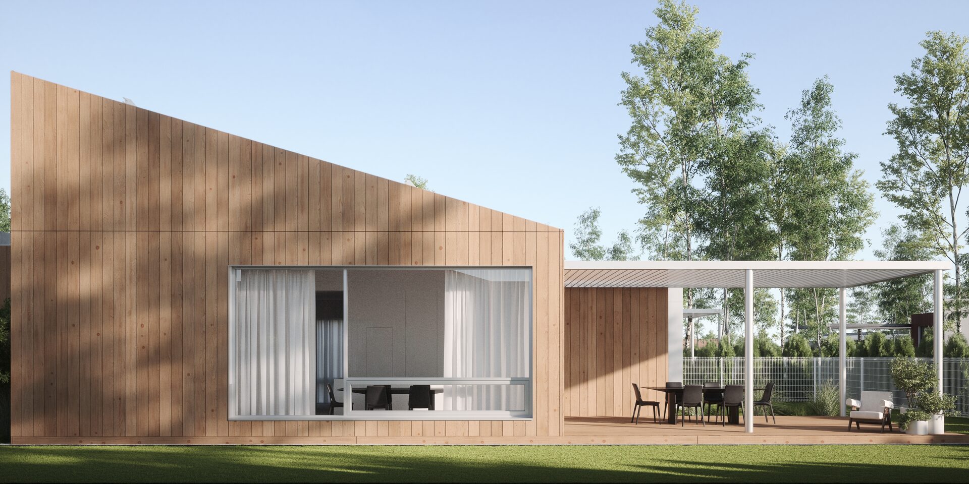 — Металлические панели, доска из лиственницы;