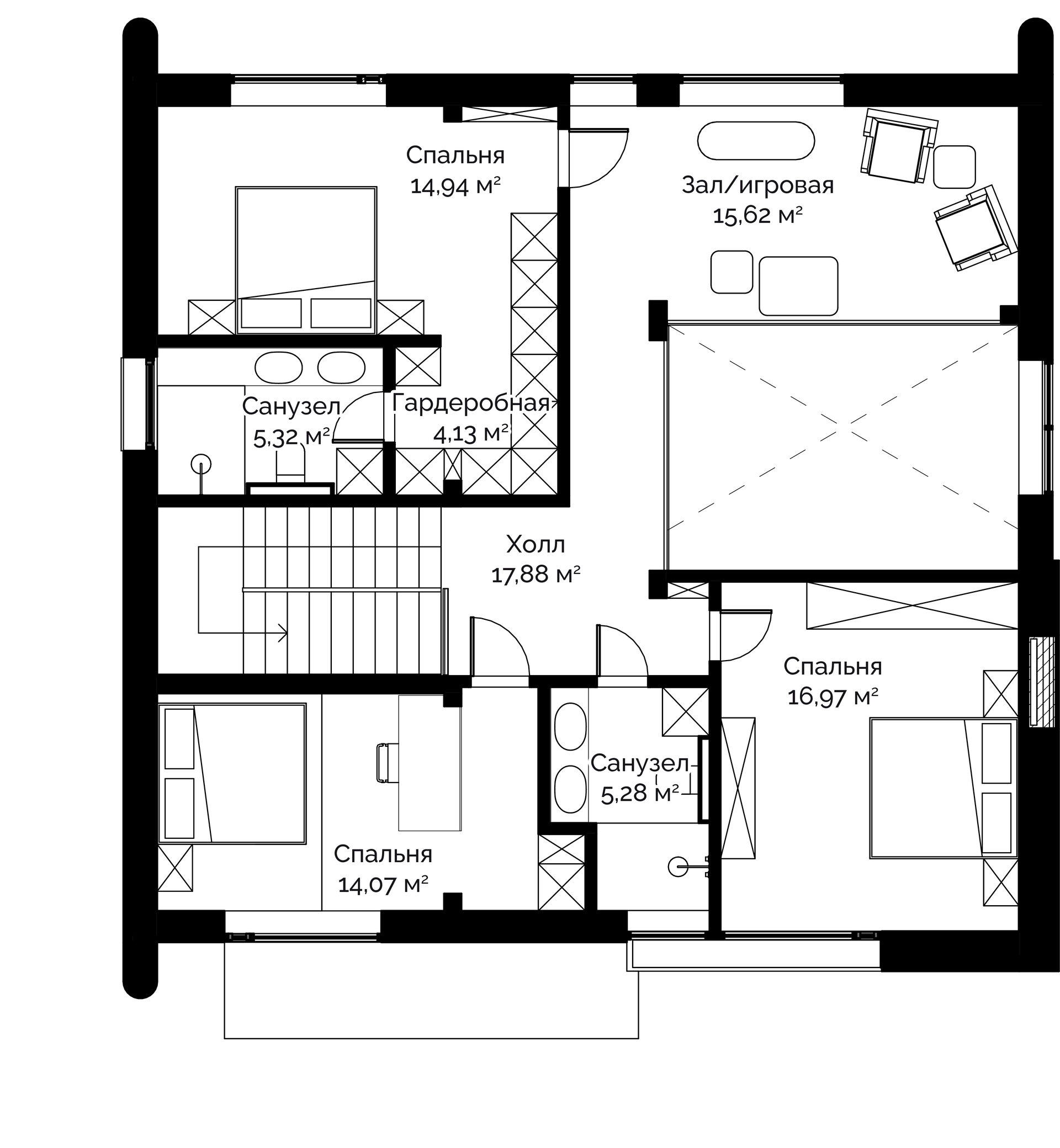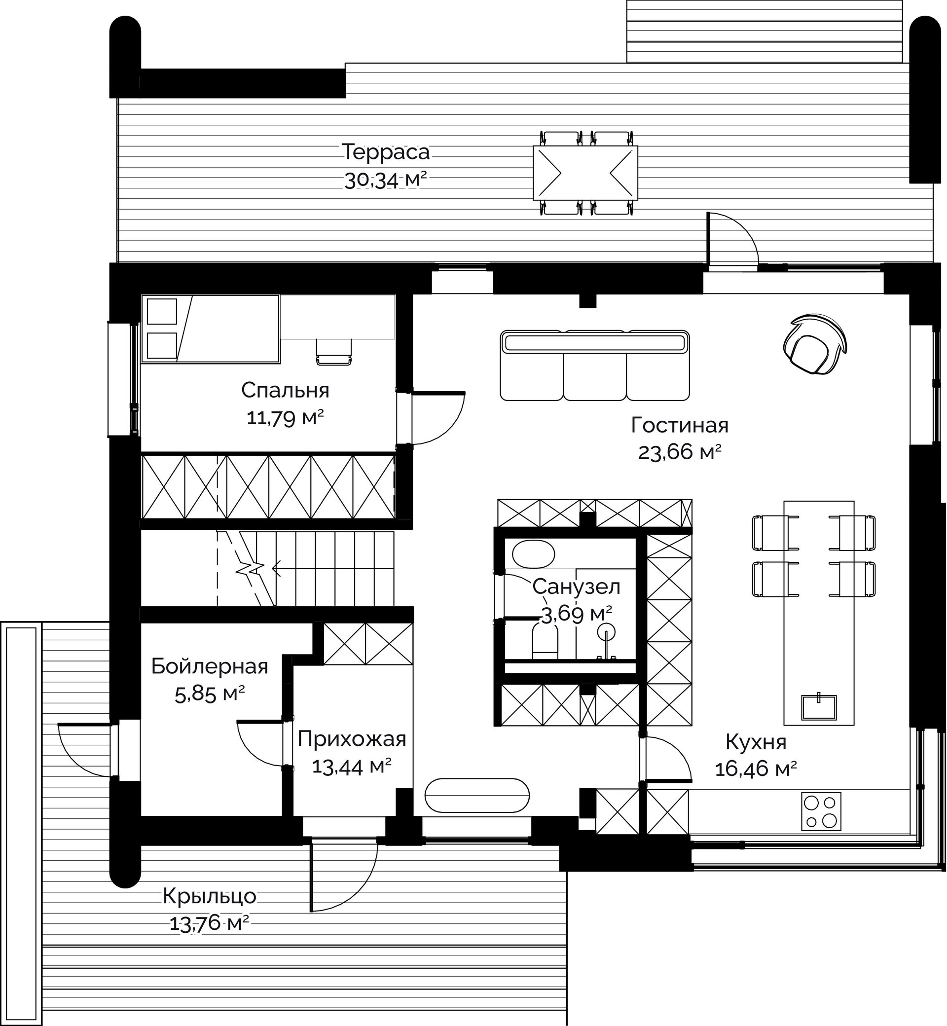 Отмостка — «Мягкая» по периметру здания с засыпкой щебнем.